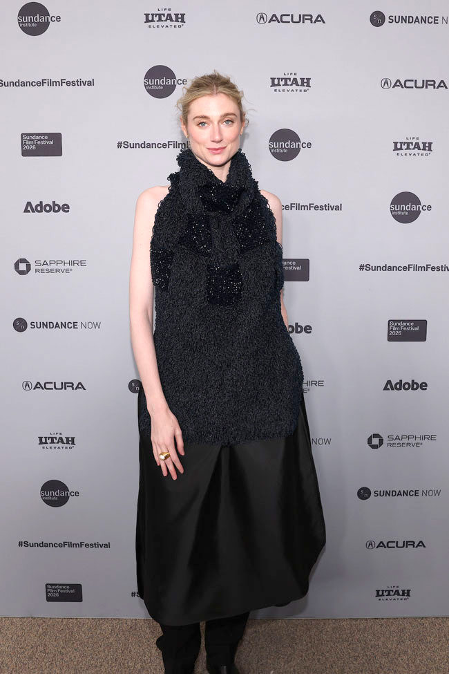 The whole look is a black void, but we tell – by peering intently – that the jacket has an interesting shape to it. Sundance is the one place where you won’t hear us complaining about turtlenecks on the red carpet, but we do think she’d have benefitted from one in a deep color.