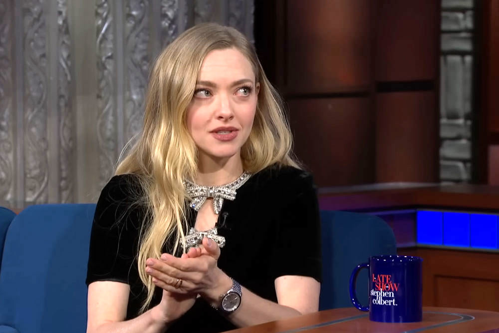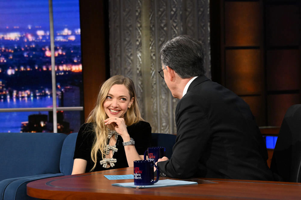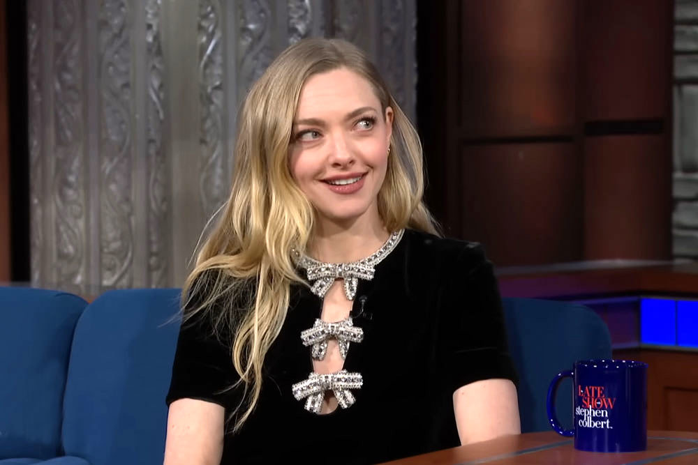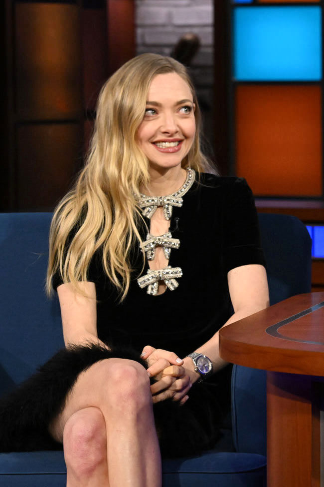 We are deeply impressed by the design of Amanda Seyfried’s dress — not in an admiring way, but in a “How did such a tiny frock manage to piss us off so much?” The star of The Testament of Ann Lee stopped by Late Night in the latest iteration of her Puritan Chic promo mode: