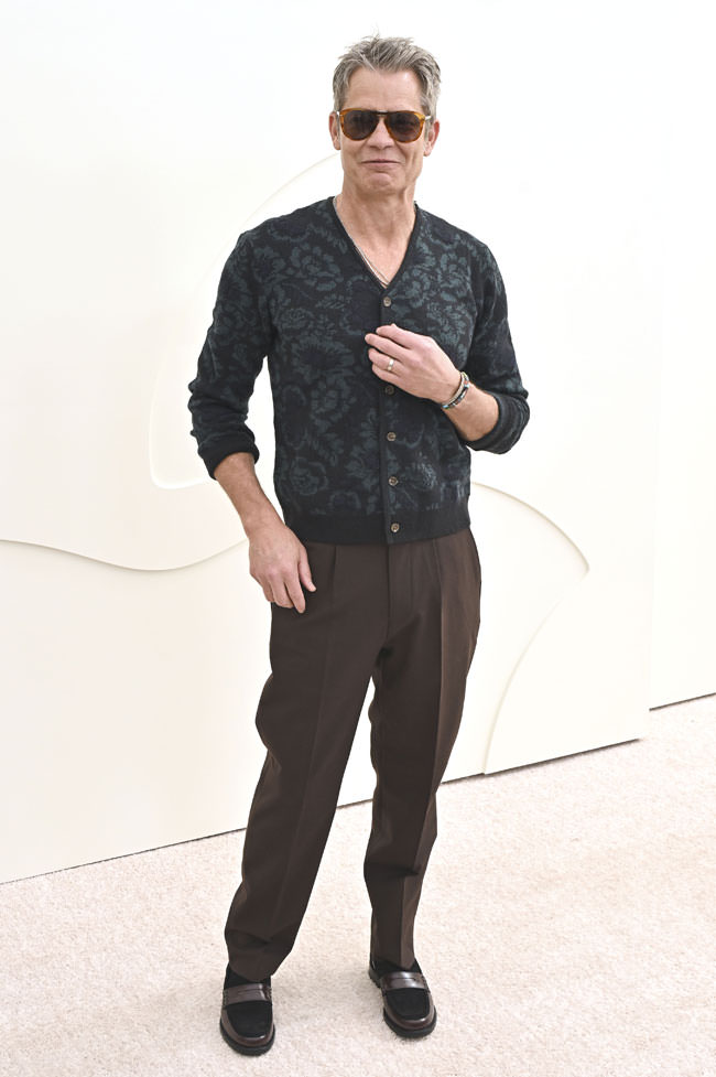A floral cardigan worn without a shirt underneath would look totally Nana on 99% of male wearers, but he’s that 1% who can get away with almost anything. Love all of the items he’s sporting, but we wouldn’t have paired that sweater with brown pants. Gray ones would have been our choice.