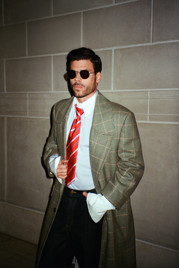 He got done dirty. The coat is the only thing that’s working here and even then, the white lining is giving us eyelid twitches. But he’s still got that face and the shades are doing a killer job of framing it nicely. You just need to focus on that and not on the clown tie or the ridiculous cuffs.