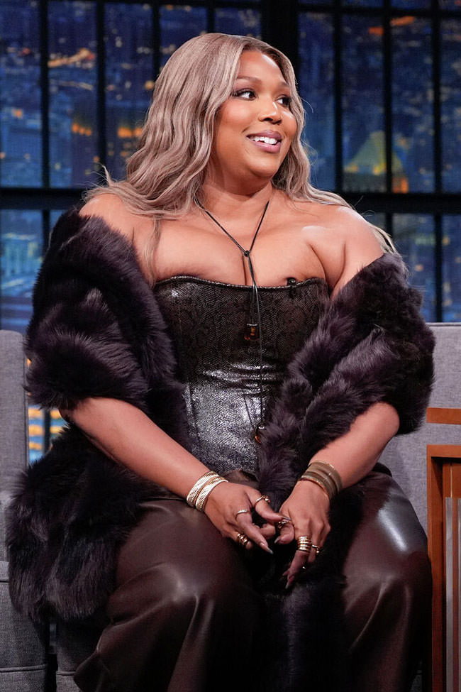 Lizzo came to Late Night to sit uncomfortably in a total mistake of an outfit. Might as well be blunt about it, since you can all see the picture above.