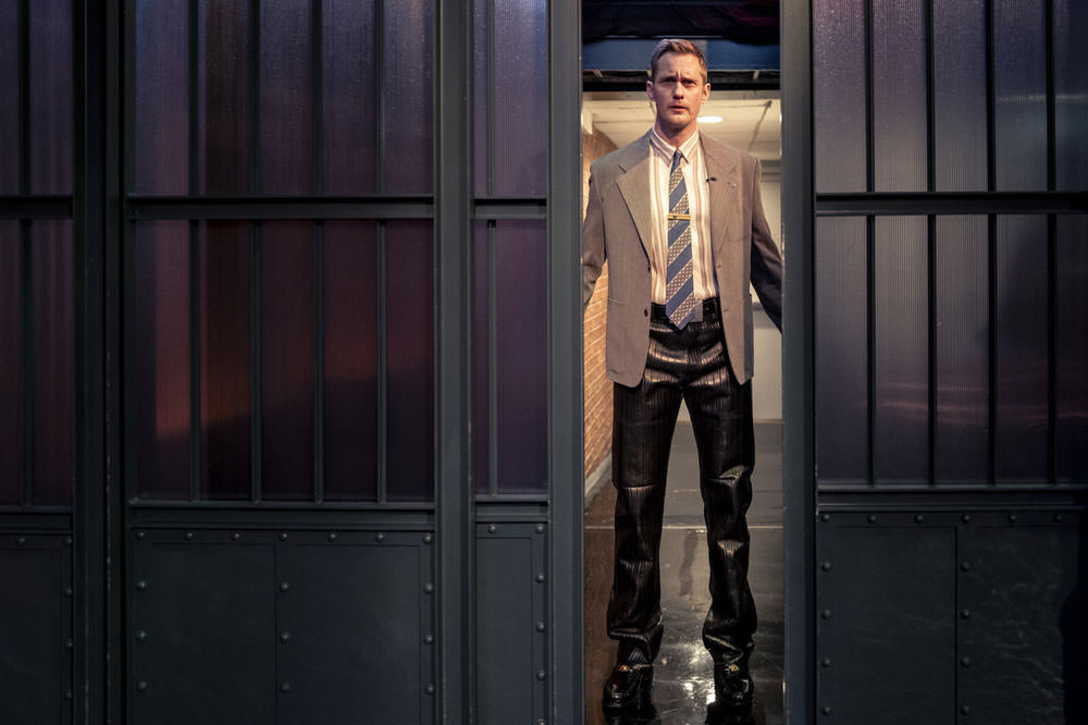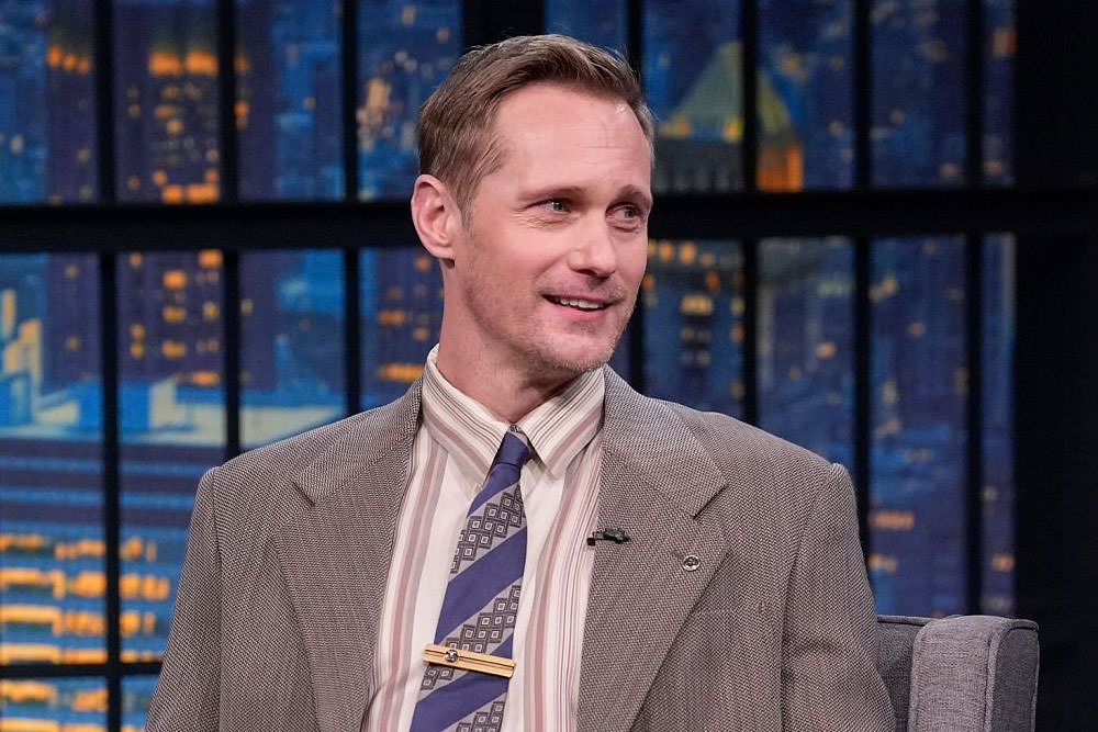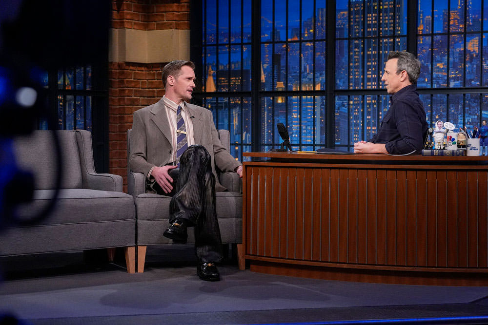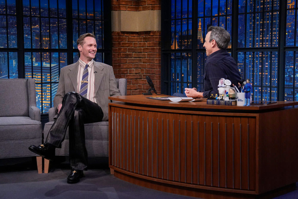 Pillion star Alexander Skarsgard continued his current practice of dressing like an ’80s menswear model at a fetish ball as he stopped by Late Night to chat with Seth Meyers.