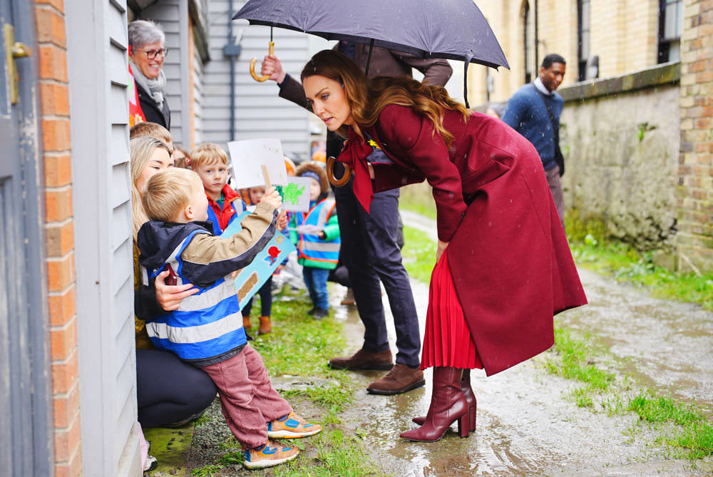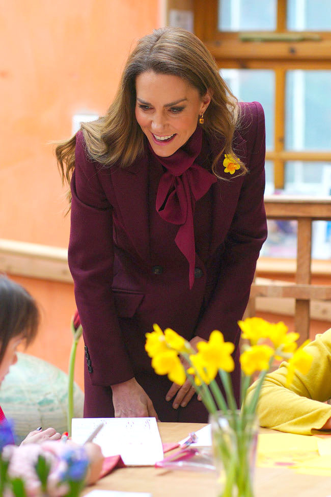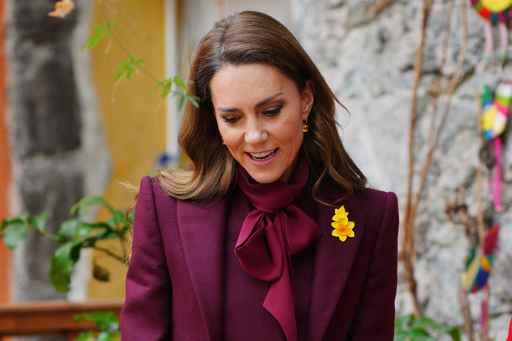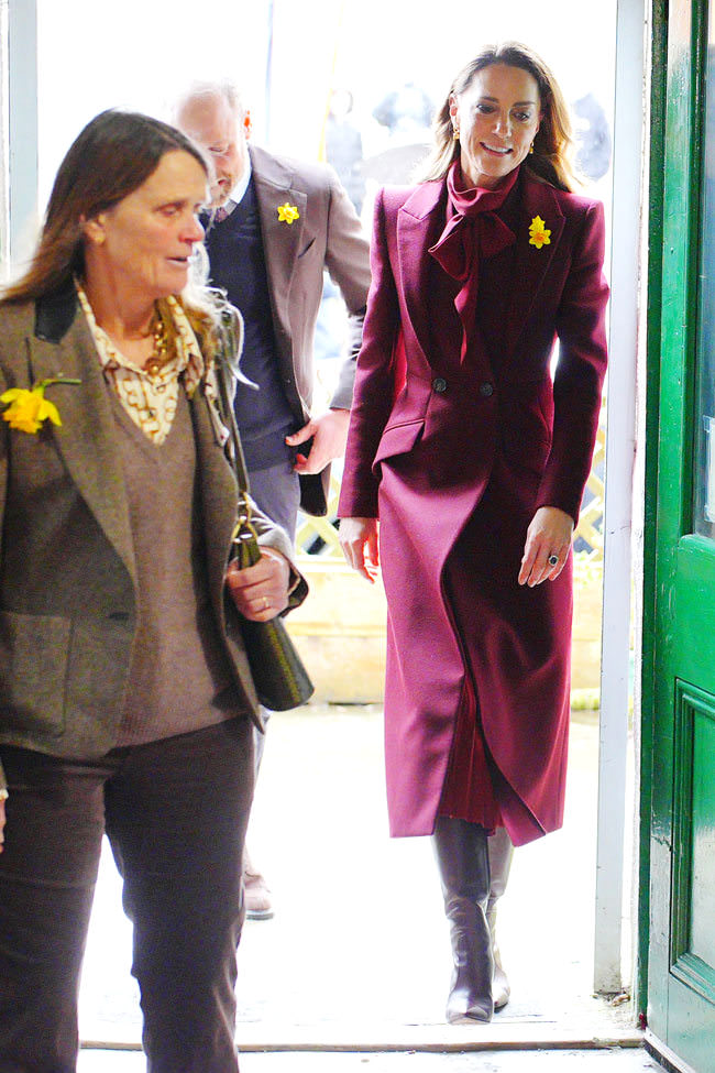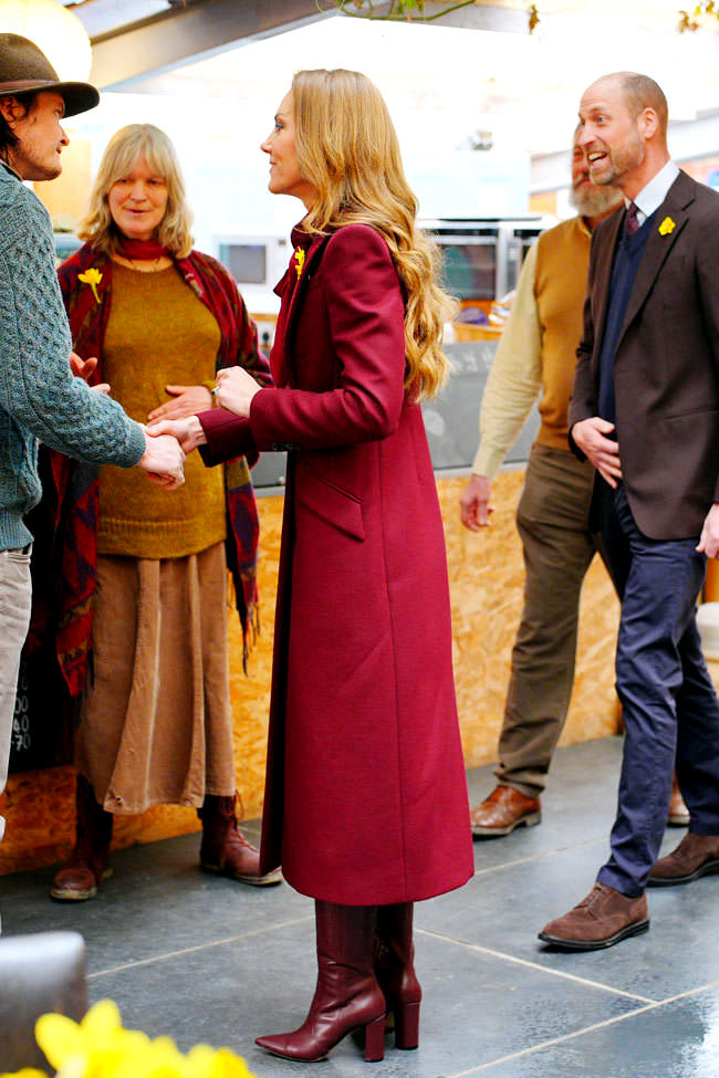 Princess Cathy loves herself some theme-dressing, so it’s perhaps not a surprise she got herself all done up in red and finished the look off with some daffodils in honor of the upcoming St. David’s Day as she and Prince William visited the Hanging Gardens in Llanidloes, Wales today.