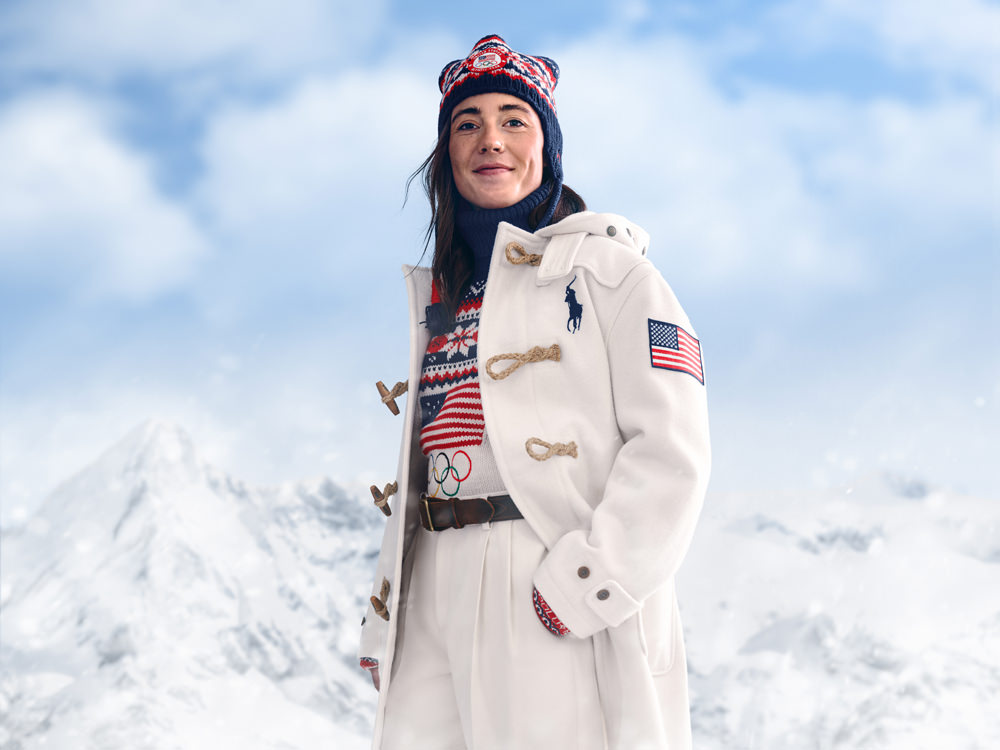 The Opening Ceremony uniform features a statement winter-white wool coat with heritage-inspired wooden toggles, an iconic American flag