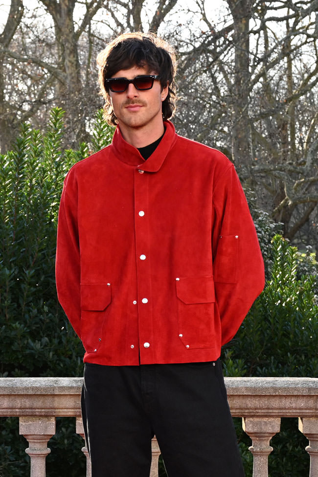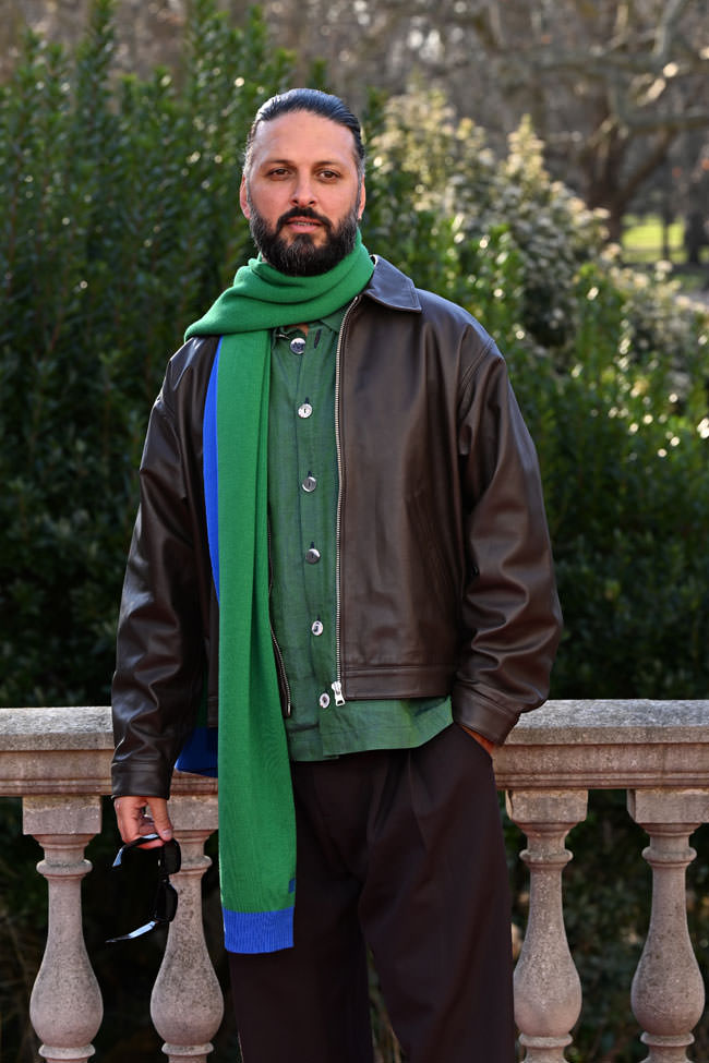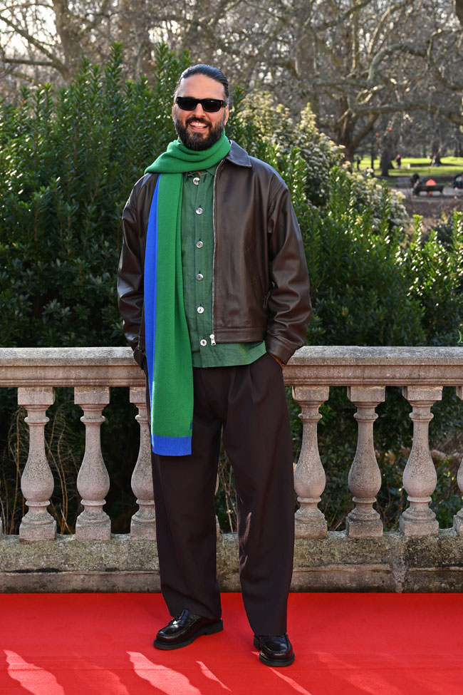 This is a perfectly fine outfit. If we wanted to nitpick it, we’d say that one of the greens should probably go. This isn’t a criticism, because there’s nothing wrong with what he’s wearing, but it doesn’t really feel like a photo call look at all. He looks like a stylish guy on his way to work.