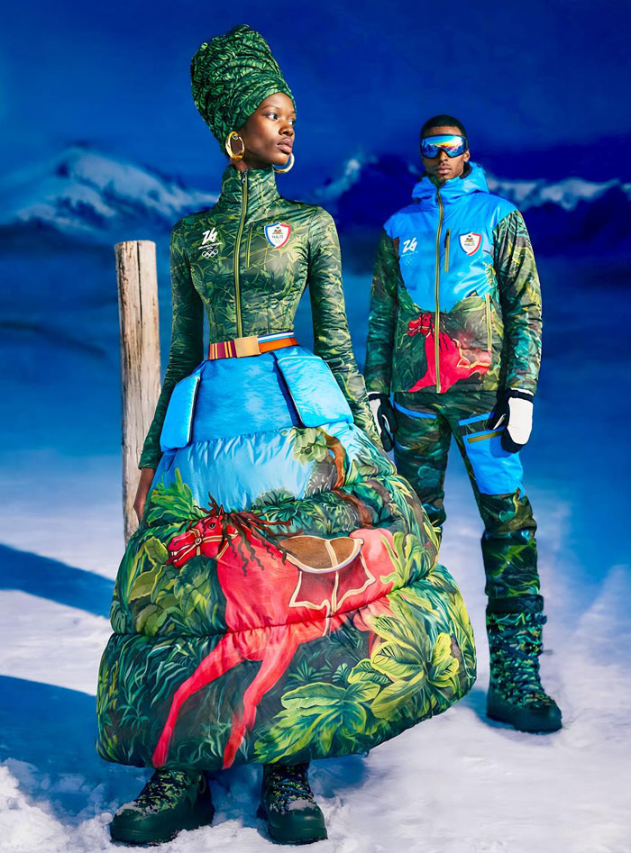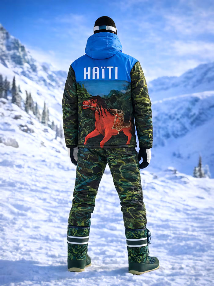 Italian-Haitian designer Stella Jean designed the hand-painted uniforms for Haiti’s Winter Olympic team, drawing inspiration from Haitian-American artist Edouard Duval-Carrié‘s painting of the revolutionary leader Toussaint Louverture.