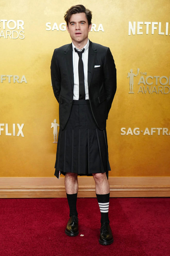 Sorry, but this just feels tired — not the skirt-wearing, which is always fun, but the ensemble, which has been worn a thousand times on the red carpet.