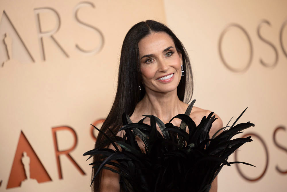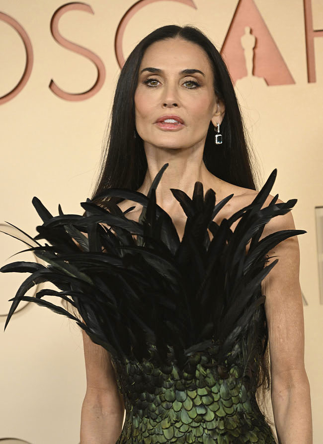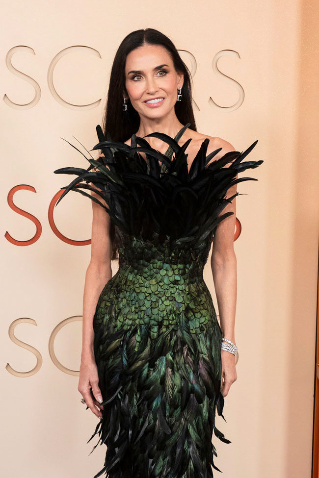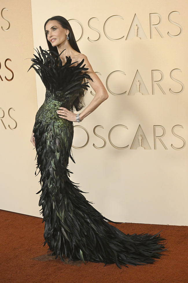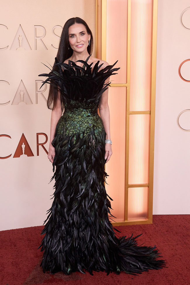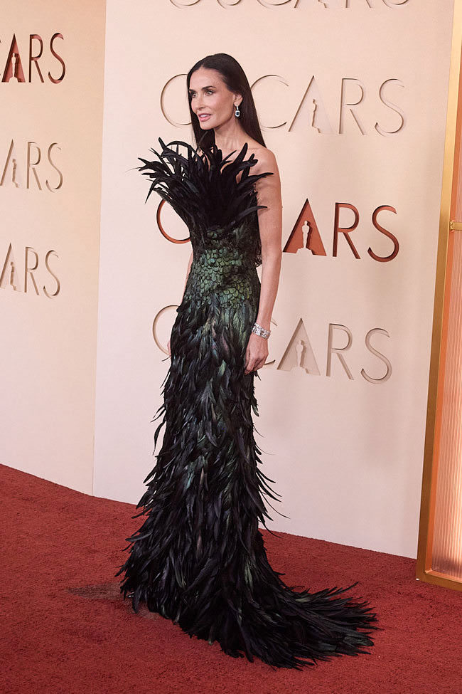 Alright kittens, we’ve been opinionating on the Oscars red carpet for going on 24 hours now, so we’re going to take a short break, eat some box mac and cheese, and stare at the wall for a bit while we recharge our bitchbatteries. In the interim, you are tasked with taking over the bitchduties vis a vis Demi Moore’s feather duster dress.