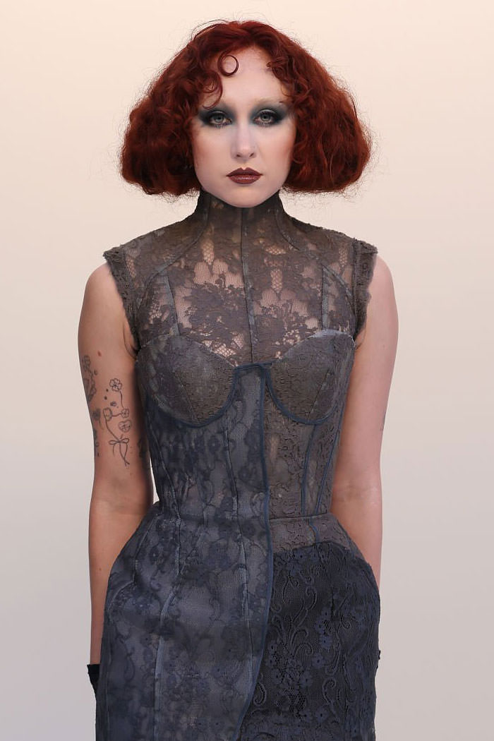 This is the most conventional she’s ever looked in public. We want to say that we’re bored by it, but she looks pretty and besides, no one should be expected to stick to the same look forever. The bob is cute. The dress is okay. It does something interesting things with the various laces and sheers, but we think the skirt gets too tricky.