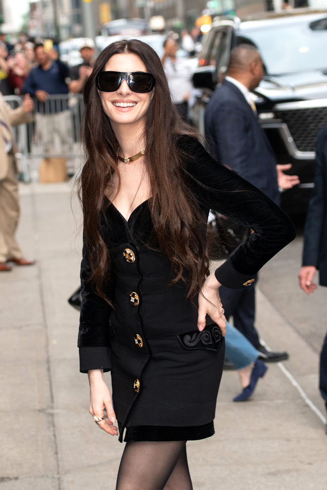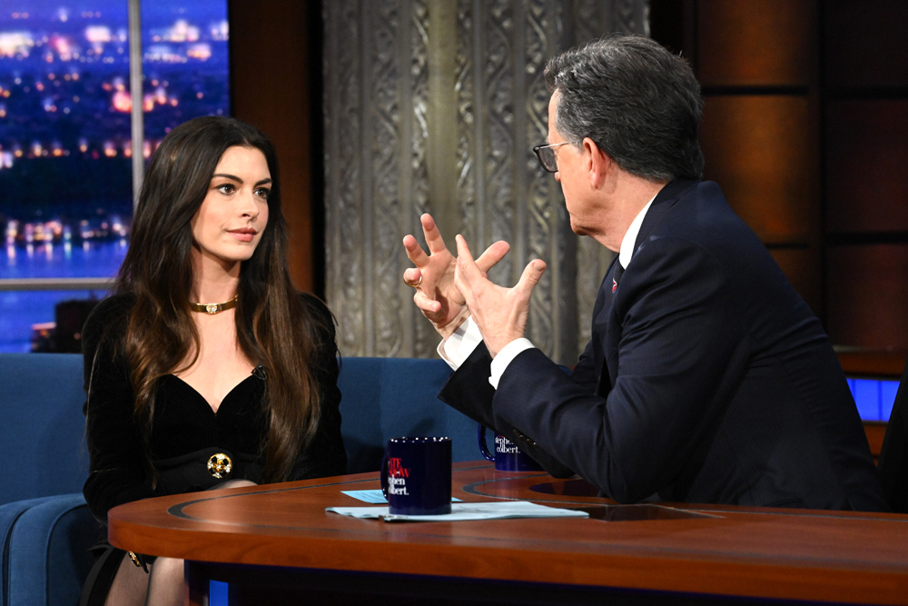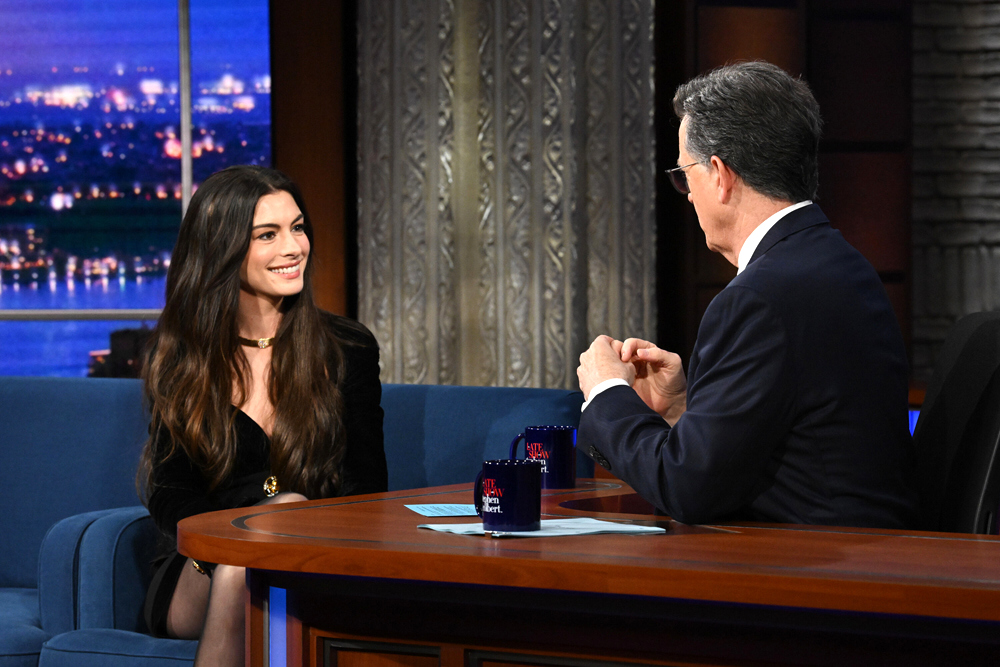Busy girl Anne Hathaway took time off from her various Mother Mary and The Devil Wears Prada 2 appearances to stop by Stephen Colbert’s place for one last chat together. She got a little retro for the occasion in an archival Atelier Versace piece and some big-ass clodhoppers.