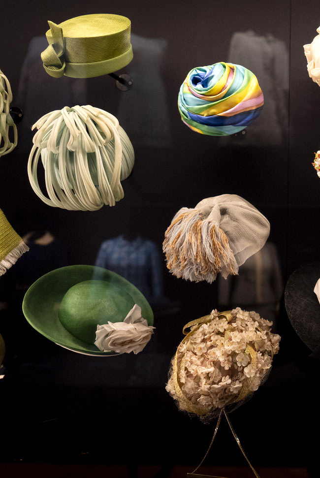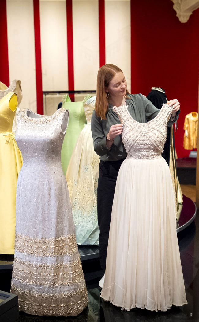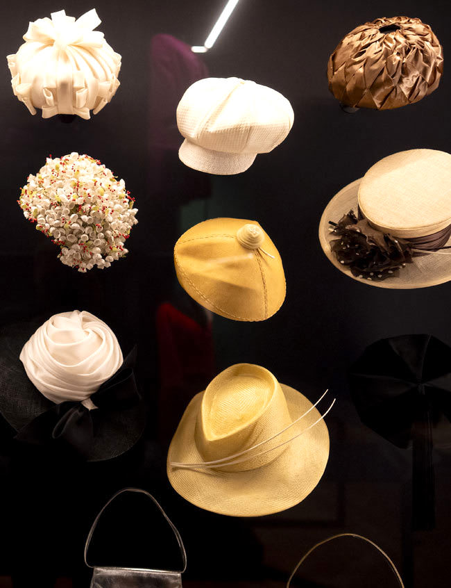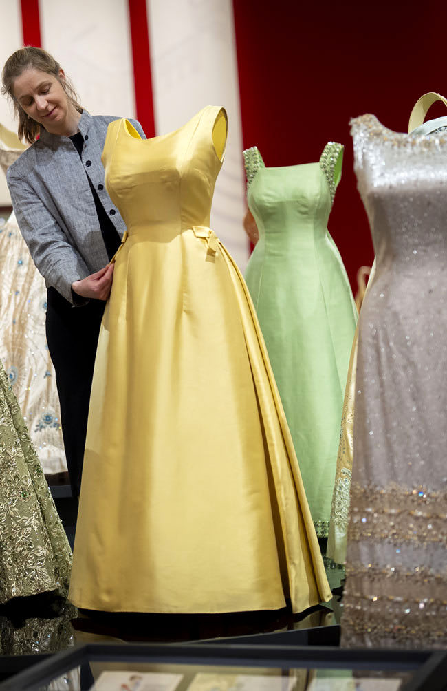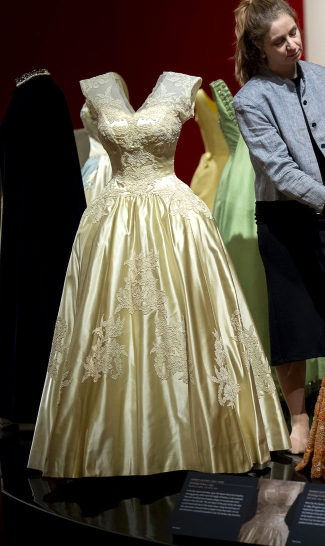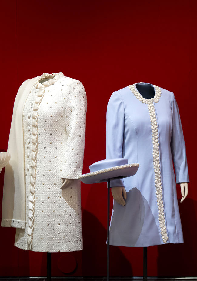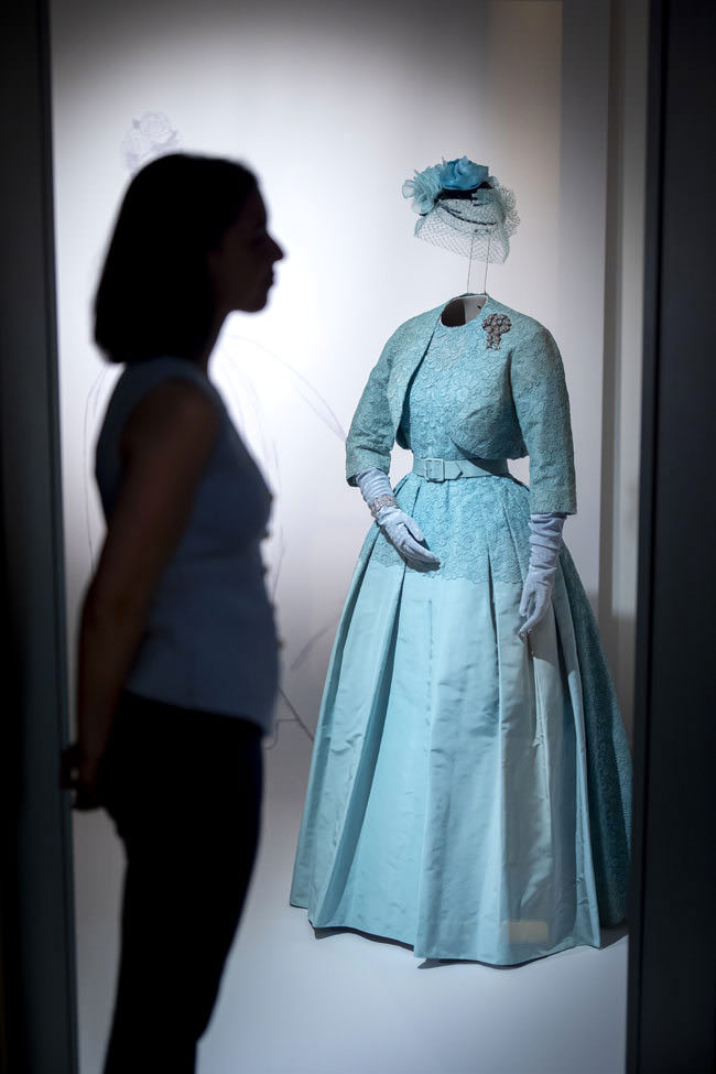 Couture eveningwear by the late Queen’s most influential designer, Norman Hartnell, will include a magnificent, apple-green gown worn for a state banquet given for President Eisenhower at the British Embassy in Washington, D.C. in 1957. Clothing worn for milestone family moments will include the crinoline-skirted blue gown and matching bolero jacket worn for her sister Princess Margaret’s wedding in 1960: the last time full-length dress was worn for a royal wedding in England. The Queen’s dress echoed the bride’s silhouette and was complemented by a hat adorned with three large blue silk roses – perhaps a nod to the bride’s name, Margaret Rose.