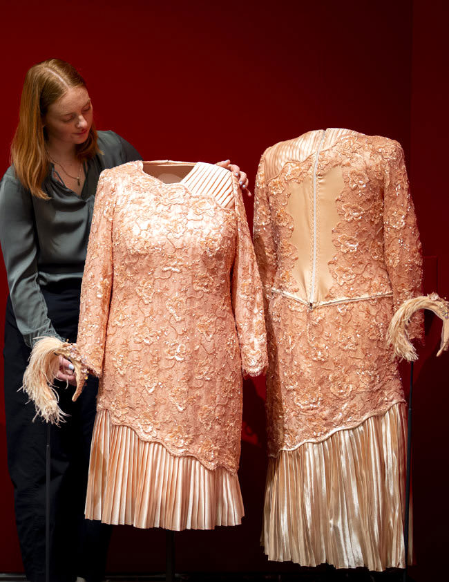Behind-the-scenes fashion illustrations, some with handwritten annotations by designers, the Queen’s dresser or even the late Queen herself, will give visitors a glimpse into the thoughtful decision-making and craftsmanship behind each outfit. A never-before-displayed sketch by Norman Hartnell shows the design and proposed fabric of a silver lamé dress designed for a State Visit to France in 1972. The Queen would annotate sketches to record which ensemble had been worn where and for what occasion, and a note on the sketch in Her late Majesty’s handwriting reads ‘opening parliament Canberra’, indicating that the dress was worn again for a subsequent tour, in keeping with her repeated re-wearing of clothing.