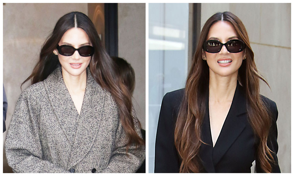 It’s looking a little too broadcast journalist to us, but we can’t say it’s awful or wrong. Just kind of serious and businesslike for an actress on a promo tour. The skirt and bare legs work better with a much simpler jacket.