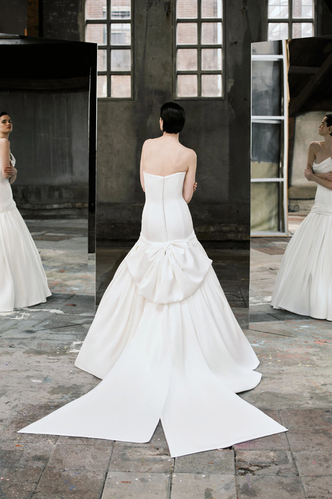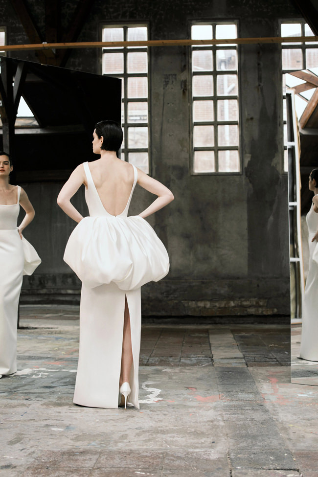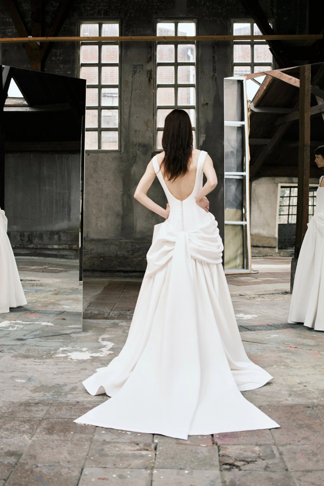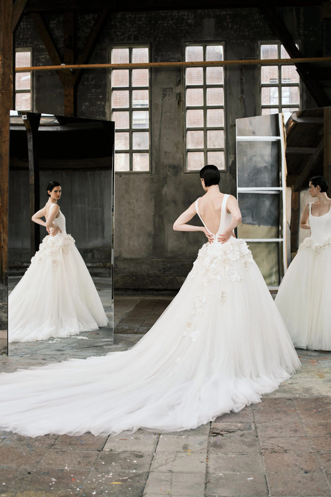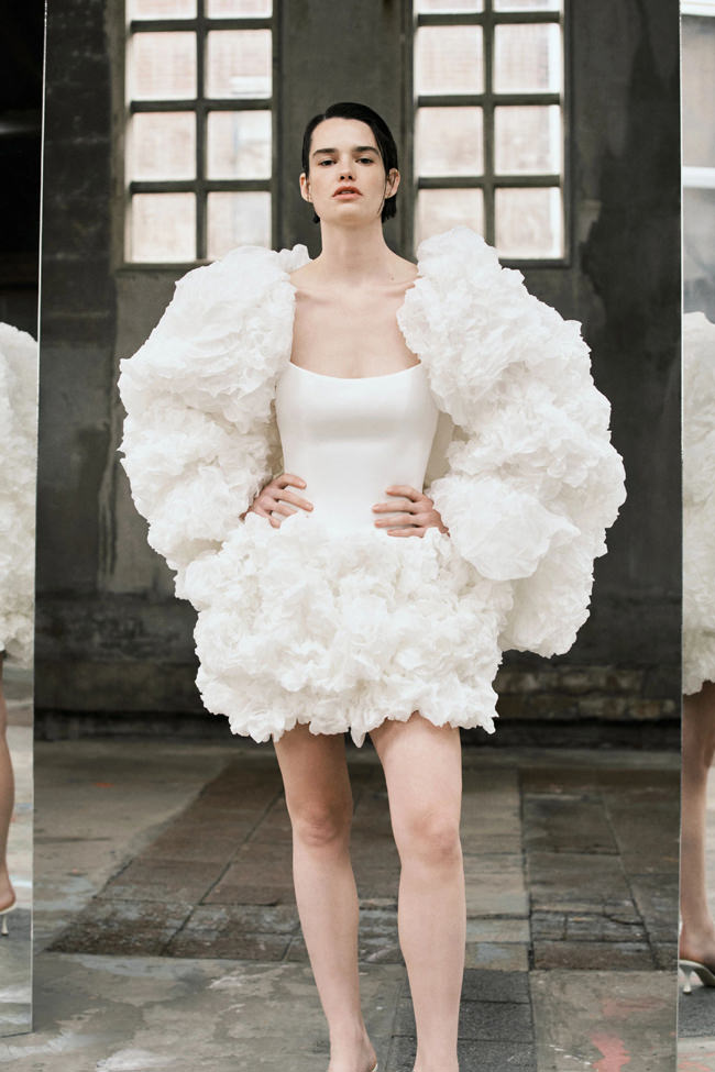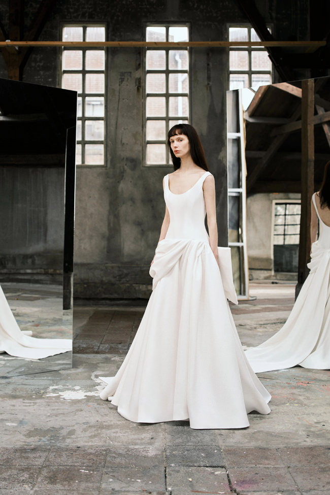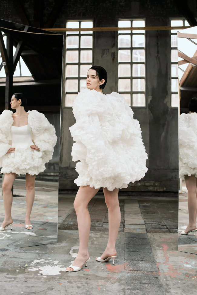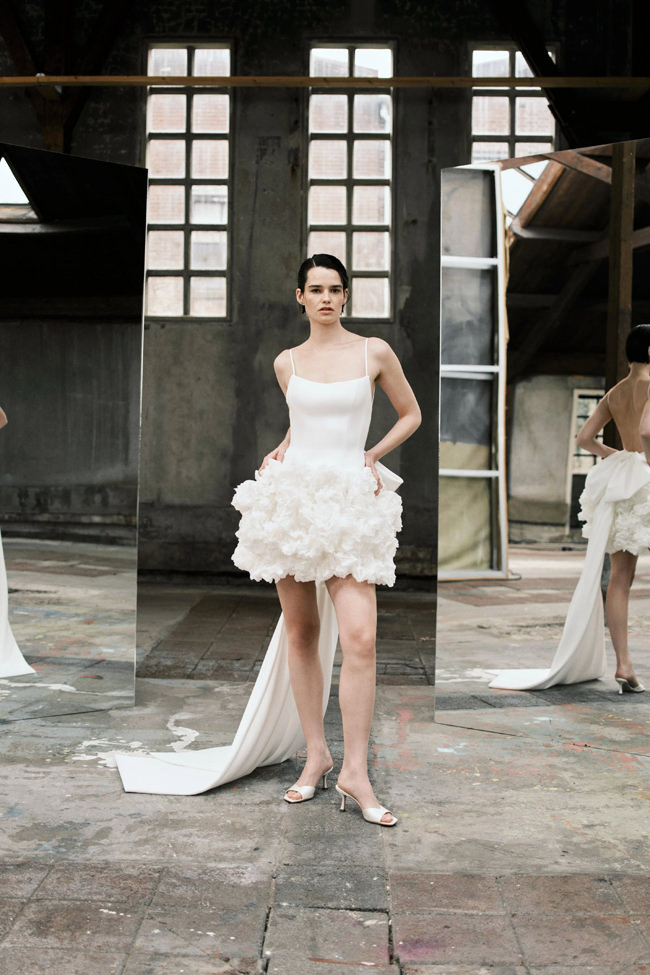 This vision translates directly into the gowns. From signature ballgowns and flowing A‐lines to clean columns, new scooped necklines, romantic curves, and floral abstractions present silhouettes that embody a modern bride’s desires. Crafted in satins, mikado, Italian faille, airy organza, and tulle, the gowns appear luminous and dimensional as light catches their volumes from every angle.