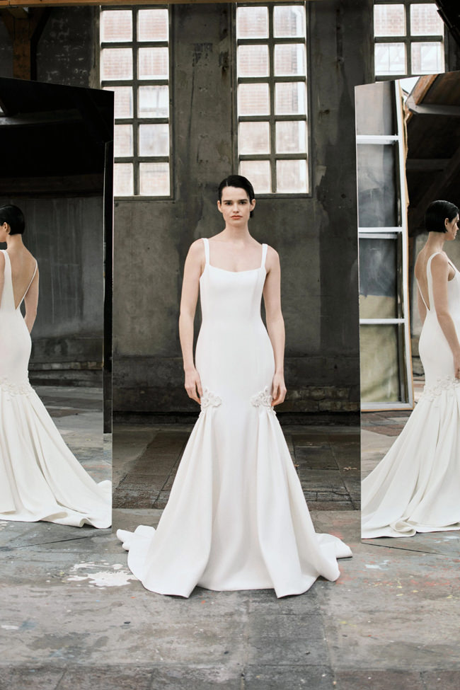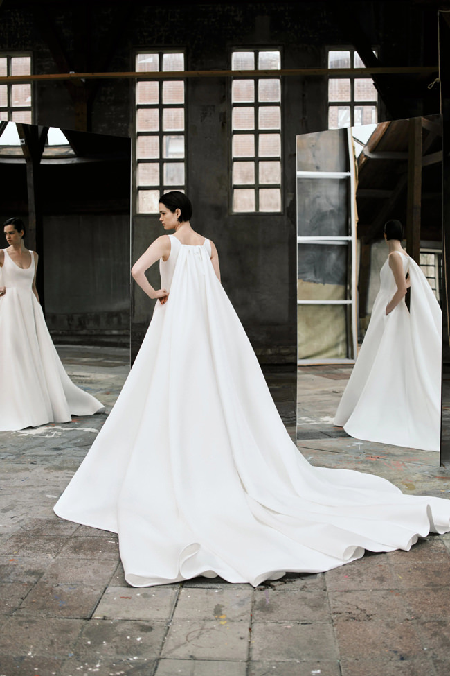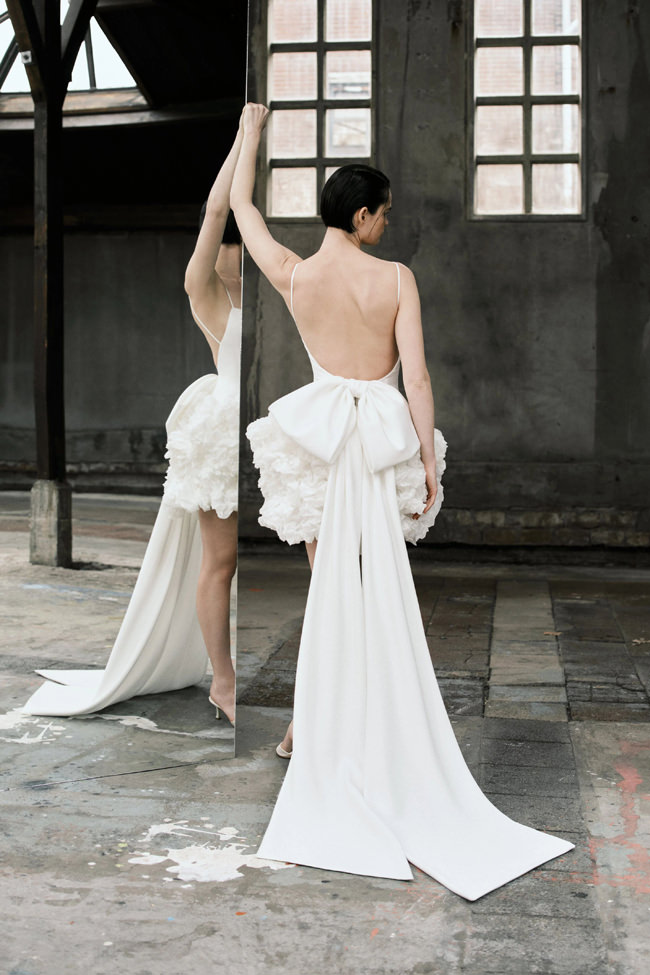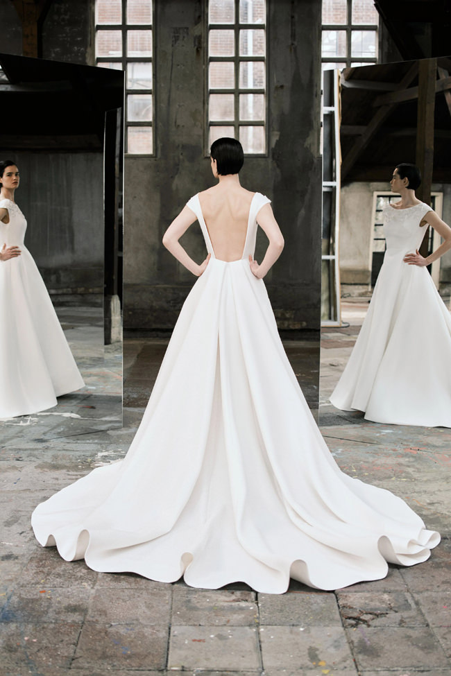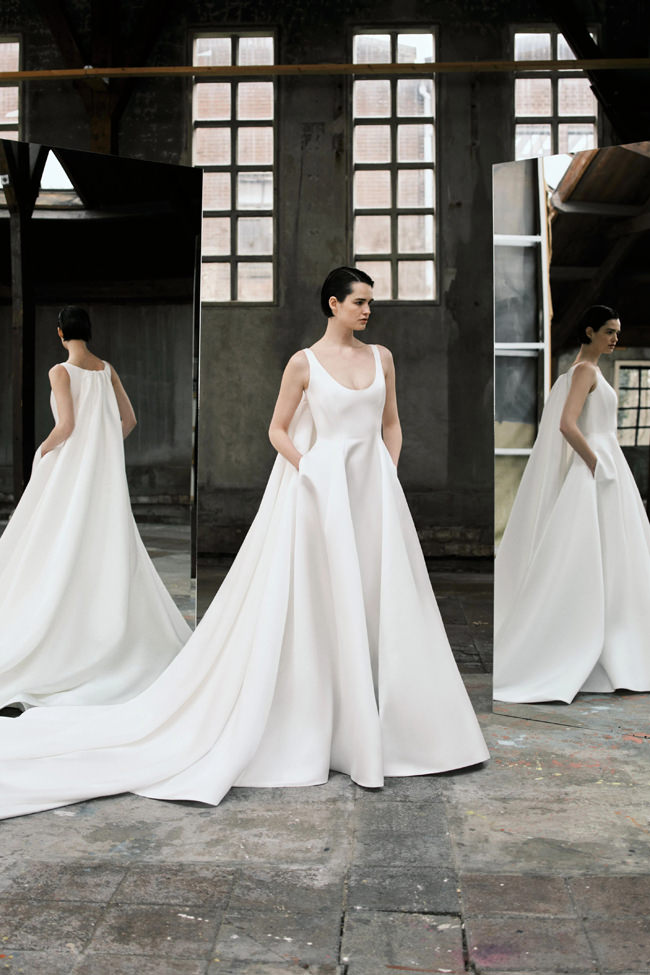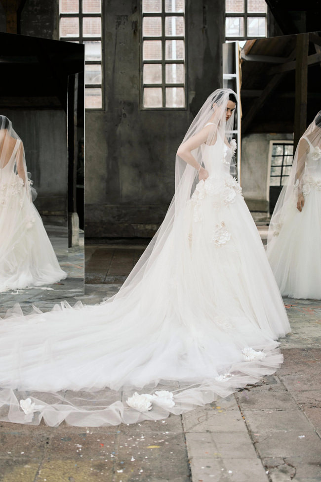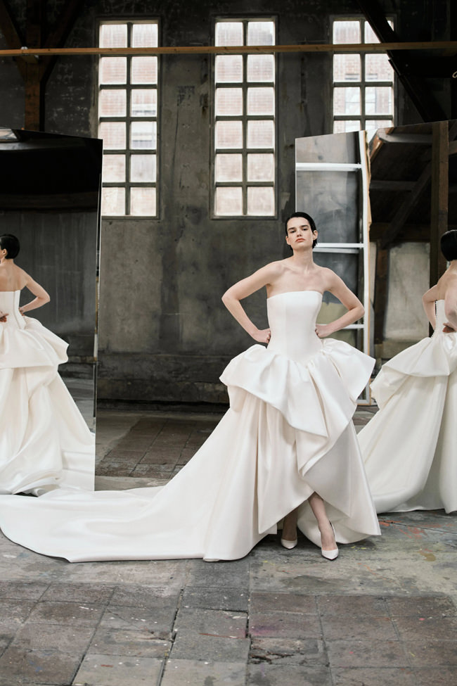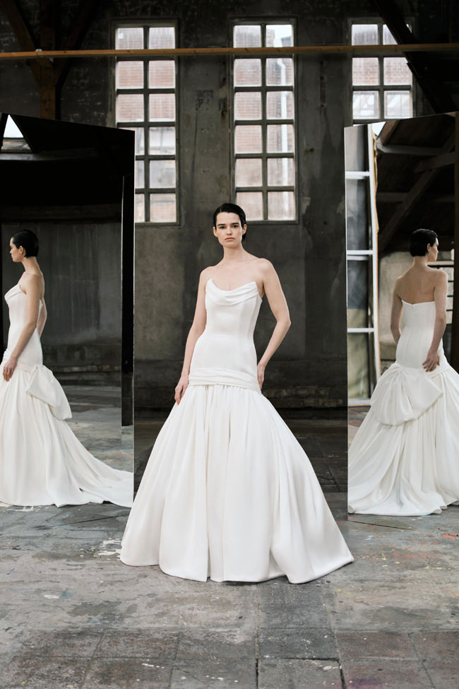 This vision translates directly into the gowns. From signature ballgowns and flowing A‐lines to clean columns, new scooped necklines, romantic curves, and floral abstractions present silhouettes that embody a modern bride’s desires. Crafted in satins, mikado, Italian faille, airy organza, and tulle, the gowns appear luminous and dimensional as light catches their volumes from every angle.