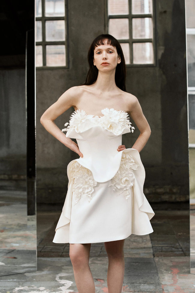 The Blushing Bouquet gowns embody this season’s artistry: flowers – roses, lilies of the valley, dahlias, and anemones – appear to bloom infinitely across the silhouette, as if growing directly from the fabric. The Couture Cloud dresses bring a dreamlike quality to the collection, with couture‐crinkled organza recalling the ephemeral softness of clouds. Completing the narrative, the Floral Devotion ballgown introduces a new scoop neckline paired with a signature tulle skirt, balancing modern elegance with unmistakable Viktor&Rolf romance.